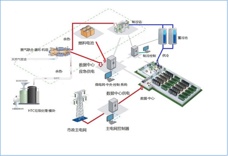 取代柴油機備份電源,大大降低冗余供電設施的規模,并充分利用已建成的冗余供電設施為數據中心的制冷模塊供電和供熱,降低數據中心的運營成本;